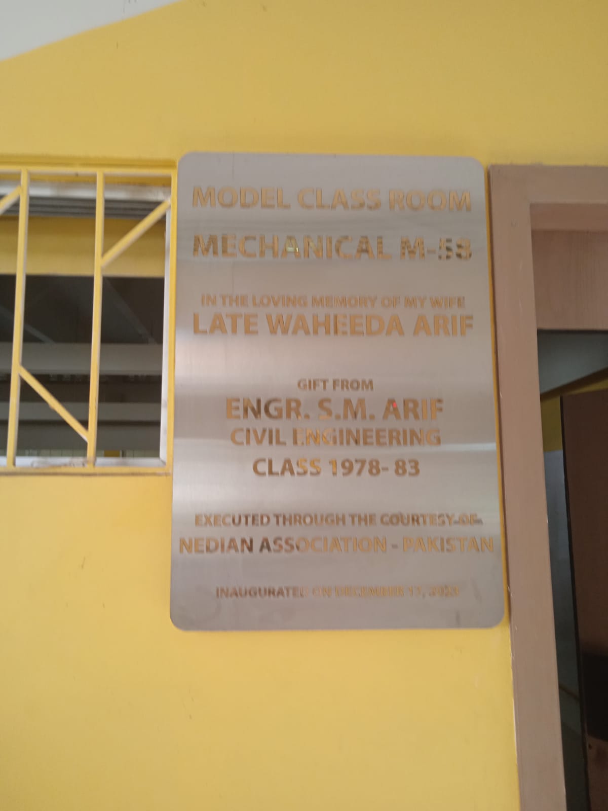 The Department of Mechanical Engineering has inaugurated Model Classroom M-58, a generous gift from Engr. S. M. Arif (Civil Engineering, Class of 1978–83) in loving memory of his wife, Late Waheeda Arif. The facility was established through the courtesy of the NEDIAN Association – Pakistan and inaugurated on December 17, 2023.