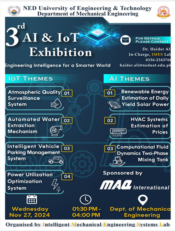 The 3rd AI & IoT Exhibition at NED University's Mechanical Engineering Department showcased student innovation and technical excellence. The event was held in November 2024 and proudly supported by MAQ International.